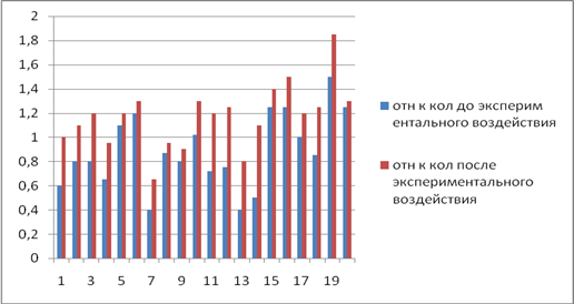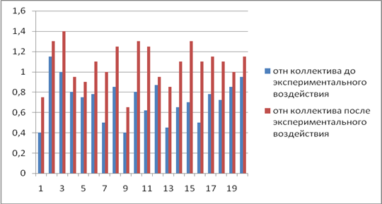 Рис 5. Распределение результатов по шкале «отношение к коллективу» до и после эксперимента.