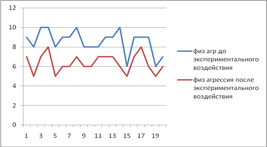 Рис. 7. Распределение результатов по шкале «физическая агрессия» до и после эксперимента.