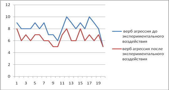 Рис. 8. Распределение результатов по шкале «вербальная агрессия» до и после эксперимента.