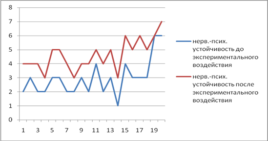 Рис. 9. Распределение результатов по шкале «нервно – психическая устойчивость» до и после эксперимента.