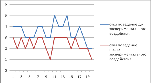 Рис. 10. Распределение результатов по шкале «отклонения в поведении» до и после эксперимента.