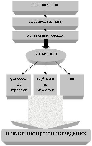 Социальные конфликты делятся на: 1. Межличностные. 2. Между личностью и группой. 3. Между малыми, средними, большими социальными группами. 4. Межгосударственные. Так как воинский коллектив представляет собой общность людей и предполагает постоянное взаимодействие между военнослужащими по вопросам профессиональной деятельности, то я в своей дипломной работе взял за основу межличностный конфликт, то есть противоречия, которые возникают между двумя людьми. Внутриличностные конфликты делятся на: 1. Между «хочу» и «хочу». 2. Между «могу» и «не могу». 3. Между «хочу» и «не могу». 4. Между «нужно» и «нужно». 5. Между «хочу» и «нужно». 6. Между «нужно» и «не могу»[13]. Проанализировав множество подходов к пониманию конфликтов, можно сказать, что конфликт - весьма сложное социальное и психологическое явление, успешность изучения которого во многом зависит от качества исходных методологических и теоретических предпосылок, используемых методов. 1.2 Психологический анализ механизмов влияния конфликтов на совершение отклонений в поведении военнослужащими Современные знания о девиантном поведении личности позволяют утверждать, что мы имеем дело с чрезвычайно сложной формой социального поведения личности, детерминированного системой взаимосвязанных факторов. К сожалению, единая теория отклоняющегося поведения личности еще не создана. В то же время обширные сведения по данному вопросу накоплены в различных научных дисциплинах: медицине, биологии, психологии, социологии, праве. Обзор различных теорий, на наш взгляд, дает возможность получить относительно целостную картину изучаемого явления в свете современных знаний о нем. Таким образом, в данной главе будут рассмотрены исторические и современные научные взгляды на механизмы влияния конфликтов на формирование отклонений в поведении, а также природу отклоняющегося поведения: его детерминацию, закономерности формирования, механизмы функционирования. Особого внимания заслуживает вопрос о детерминации отклоняющегося поведения. Под детерминацией понимается совокупность факторов, вызывающих, провоцирующих, усиливающих или поддерживающих отклоняющееся поведение. Ученые различных направлений выделяют следующие группы факторов, детерминирующих отклоняющееся поведение личности[14]: —внешние условия физической среды; —внешние социальные условия; —внутренние наследственно-биологические и конституциональные предпосылки; —внутриличностные причины и механизмы отклоняющегося поведения. Рассмотрим современные теории отклоняющегося поведения. В настоящее время в отечественном и зарубежном гуманитарном знании сформировалось несколько теорий отклоняющегося поведения. Исходя из нашей классификации факторов девиантного поведения, рассмотрим теории по порядку от социологических теорий, акцентирующих внимание на внешнесоциальных факторах девиантности, через научные представления о ее внутренних, конституционально-биологических, условиях к психологическим концепциям, раскрывающим индивидуально-личностные механизмы отклоняющегося поведения. К внешним физическим условиям девиантного поведения можно отнести такие факторы, как климатический, геофизический, экологический и др. Например, такие явления, как шум, теснота, геомагнитные колебания, потенцируя стресс, могут стать не
