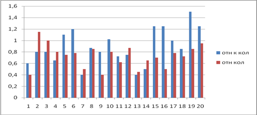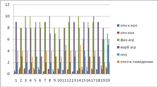 Данные распределились следующим образом. Минимальное значение признака по шкале «отношение к коллективу» равно 0,4. Военнослужащие, у которых по данной шкале именно такой балл, то можно с уверенностью говорить, что у них сильно выражено конфликтное взаимодействие с воинским коллективом. Максимальное значение равно 1,5. Военнослужащие, имеющие такой балл по данной шкале, вступают в конфликт с коллективом редко. Но говорить о полном отсутствии вероятности вступления данных военнослужащих в конфликт не приходится. Чем меньше значение по данному признаку, тем больше конфликтность. Среднее значение по данной шкале равно 0,88. Конфликтное взаимодействие, возникающее между военнослужащим и воинским коллективом, ведет к опасному виду отклоняющегося поведения - самовольному оставлению части. По данным экспертного опроса офицеров военнослужащие, имеющие самые низкие показатели по данному признаку, были замечены в совершении данного вида отклоняющегося поведения. Минимальное значение признака по шкале «отношение коллектива» равно 0,4. К военнослужащим, имеющим по данной шкале такой балл, сильно выражено конфликтное отношение со стороны воинского коллектива. Максимальное значение признака по данной шкале равно 1,15. Чем ниже показатель значения признака по данной шкале, тем хуже к данному военнослужащему относится воинский коллектив. Среднее значение по данной шкале равно 0,72. Это говорит о наличии неуставных взаимоотношений между военнослужащими. По данным экспертного опроса офицеров большинство военнослужащих экспериментальной группы характеризующихся по данной шкале были замечены в совершении данного вида отклоняющегося поведения. Если анализировать данную экспериментальную группу по дополнительным семи шкалам модульной методики, то видно, что военнослужащие, имеющие высокую конфликтность, недобросовестно относятся к своим служебным обязанностям, также обладают умеренными нравственными, физическими, организаторскими и интеллектуальными качествами, низкой работоспособностью и, как правило, мешают другим членам коллектива. Поэтому трудно говорить о дальнейшем самосовершенствовании, так как военнослужащие переключаются на более легкие и комфортные способы достижения успеха в коллективе. В дальнейшем было проведено исследование на этой же экспериментальной группе на предмет агрессивности – физической и вербальной, а так же измерен уровень нервно – психической устойчивости. Как мы уже говорили выше, конфликтность в межличностном взаимодействии предполагает некие внешние проявления, которые в своей основе имеют негативную окраску. То есть могут проявляться как в рукоприкладстве, так и в словесном оскорблении. И все это может происходить на фоне сильных переживаний, эмоциональной и психической нагрузки.