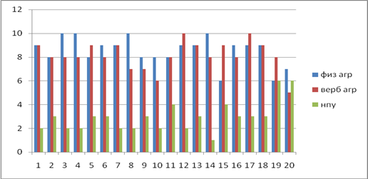 Рис. 3. Распределение признаков физической и вербальной агрессии и нервно - психической устойчивости военнослужащих экспериментальной группы. Данные распределились следующим образом. По шкале физическая агрессия самый высокий показатель 10 баллов. Он говорит о том, что военнослужащие, имеющие такой показатель способны к ярко выраженной агрессии по отношению к сослуживцам. Причем это будет проявляться в нападении, использовании физической силы по отношению к другим лицам. Стоит заметить, что показатель в 10 баллов повторяется аж 4 раза. Это очень часто, а показатель в 9 баллов повторяется 8 раз. То есть у большей части военнослужащих экспериментальной группы очень ярко выражен данный признак. И большинство опять – это военнослужащие, прослужившие три месяца, что связано, опять таки, с теми же факторами, которые объясняют повышенную конфликтность данных военнослужащих. Это чревато совершением одного из самых опасных видов отклонений в поведении – нарушению уставных правил взаимоотношений между военнослужащими. Но самое главное то, что рукоприкладство, всевозможные издевательства со стороны военнослужащих, могут привести к тому, что у лиц склонных избегать это, могут возникнуть мысли освободиться от этого, то есть кто – то на физическую агрессию будет в дальнейшем отвечать тем же, что во многом зависит от внутренних ресурсов личности, эмоционально – волевой сферы, а может просто – напросто избавиться от издевательств. А это уже может привести к другому виду отклоняющегося поведения – самовольному оставлению части. Минимальное значение по шкале «физическая агрессия» равно 6. Среднее значение равно 8,55. Максимальное значение по шкале «вербальная агрессия» равно 10 баллов. Это говорит о ярко выраженных негативных чувствах, проявляющихся через такие формы как крик, визг, а так же через содержание словесных ответов – проклятия, оскорбления, угрозы. И точно так же как говорилось выше, есть взаимосвязь между вербальной агрессией, которая впоследствии может точно так же перерасти в физическую. Значение в 10 баллов повторяется 2 раза, а значение в 9 баллов повторяется 6 раз. И опять почти у половины военнослужащих экспериментальной группы мы видим очень ярко выраженный признак вербальной агрессии, кроме того в основном это военнослужащие прослужившие три месяца. Минимальное значение по шкале вербальная агрессия равно 5. Среднее значение равно 7,25. Значения по шкалам физической и вербальной агрессии тесно переплетаются с показателями нервно – психической устойчивости военнослужащих экспериментальной группы. Это так же можно увидеть из рисунка 3. В основном почти у всех военнослужащих высокие значения физической и вербальной агрессии проявляются на фоне низкой нервно - психической устойчивости. Как мы говорили это значимый показатель при возникновении агрессии, конфликтности, а так же при совершении отклонений в поведении. Военнослужащий с низкой нервно – психической устойчивостью вполне способен в ситуации, когда по отношению к нему звучат угрозы, оскорбления, то есть проявляется вербальная агрессия со стороны оппонента в конфликтной ситуации ответить тем же, а может и применить физическую силу чтобы таким образом, как ему кажется, разрешить конфликт, но может быть и еще один вариант его поведения. В точно такой же ситуа