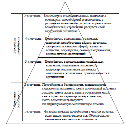 Рисунок 1. Пирамида потребностей по А. Маслоу МакКлелланд полагал, что человеку присущи три важные потребности, которые и определяют его поведение. Это – власть, успех, причастность. На производительность труда влияние оказывают следующие факторы, перечисленные в порядке убывания силы их воздействия: - возможность продвижения по службе; - повышение заработка; - оплата труда по результатам; - одобрение хорошо выполненной работы; - работа, позволяющая развивать свои способности; - сложная работа; - работа, позволяющая самостоятельно принимать решения; - высокая степень ответственности; - интересная работа; - работа, требующая творчества. Привлекательность работы определяется следующими факторами: - не требуется прилагать больших усилий; - не вызывает стрессовых ситуаций; - удобное месторасположение; - работа не грязная, без шума; - работа с людьми, которые нравятся; - хорошие отношения с начальником; - хорошая информированность о работе; - гибкий график; - дополнительные льготы; - справедливое распределение работы. Перечисленные факторы могут быть расположены в другой последовательности, и тогда управляющими могут выступать другие факторы. Кадровой службе целесообразно проводить собственные исследования, чтобы установит шкалу иерархии факторов, действующих на коллектив. Очень часто положение на работе оценивается с использованием понятия справедливость. Для большинства работающих суть понимания справедливости условий труда состоит в том, что человек сравнивает размер своей зарплаты с затраченными усилиями, а также с размером зарплаты других работников. Если человек видит, что за ту же работу другому заплатили больше, то у него возникает психологическое напряжение, чувство неудовлетворенности собой. В результате работник начинает работать хуже. Сохранение в тайне суммы выплат в организации также заставляет людей подозревать несправедливость в оплате труда. В организации должен быть установлен такой порядок, при котором работники могут и должны считать, что они получают справедливое вознаграждение. При этом люди сравнивают свое положение с положением других не только внутри своей организации, но и в других организациях. Таким образом, побуждаемые потребностями, движимые мотивацией работники ищут такие виды деятельности, которые бы в наибольшей степени соответствовали их ожиданиям. Эти поиски и ожидания постоянно корректируются внешней средой, условиями достижения желаемого, изменяющимися обстоятельствами, стимулирующими воздействиями, самооценкой работника. По сути, стимулирование и мотивация труда со стороны предприятия должны предлагать работнику такие формы удовлетворения потребностей, которые были бы в пределах возможности предприятия, способствовали бы проявлению такого трудового поведения, которое требуется предприятию, и в то же время, соответствовали ожиданиям работника. Все теории мотивации указывают на динамичность диспозиции мотивов, на неодинаковость структуры мотивационного ядра личности, на подверженность мотивации влиянию многих факторов внешней среды и динамических процессов развития личности. Отмечено наличие неких общечеловеческих тенденций в изменениях фундаментальных основ потребностей, однако эти тенденции значительно модифицируются при переходе на уровень конкретного челов