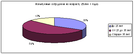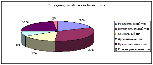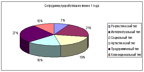 Рисунок 7 Согласно диаграмме на рисунке 6 можно сделать вывод, что сотрудники, проработавшие более года имеют ярко выраженную интеллектуальную направленность, предприимчивый тип людей находится на втором месте. Сотрудники, имеющие предпринимательские задатки, на 80% состоят из руководящих должностей по возрасту от 25 до 35 лет. Интересно заметить, что по первой части теста (при оценке сотрудниками своих наклонностей самостоятельно) можно сказать, что около 60% на самом деле не выделяют в себе предпринимательскую способность. Сотрудники, имеющие артистические наклонности, состоят в основном из младших сотрудников (помощников) и обслуживающего персонала. Сотрудники, обладающие конвенциональными задатками, на 100% находятся в возрасте старше 35 лет. Рассматривая диаграмму на рисунке 7, можно заметить, что основная масса испытуемых относится к предприимчивому типу (60% из них – люди, младше 25 лет, 68% оценивают предпринимательские способности у себя самостоятельно). На втором месте находится интеллектуальный тип (21% испытуемых), из них 80% - младший руководящий состав возрастом от 25 до 35 лет. Среди сотрудников, проработавших в банке менее 1 года наблюдается рост людей с артистическими наклонностями (более чем в 2 раза). Это можно объяснить также средним возрастом испытуемых (маленький) и статусом в организационной структуре (младший персонал). Среди этих сотрудников также увеличилась доля конвенционального типа людей – сотрудники, ориентированные на результат в работе, подчинение, социальную направленность. Это в общем основные качества для приходящих сотрудников, которые по мере карьерного роста переходят в предприимчивые и реалистические типы. Однако по результатам теста данные различаются незначительно, что позволяет сделать вывод о недостаточности полученных сведений для анализа мотивационной политики банка и ценностных ориентаций сотрудников. В общем можно сделать вывод о правильной политике подбора кадров на предприятии – политика руководителей очевидна. На работу принимаются сотрудники, имеющие необходимые деловые качества, профессиональные навыки на младшие обслуживающие и руководящие посты. На старшие руководящие посты формирование кадров происходит в основном за счет внутреннего набора сотрудников, уже имеющие ценностные ориентации компании, соблюдающие определенные правила, деловую этику, имидж компании, владеющие навыками корпоративной культуры предприятия. С помощью наставничества эти же качества прививаются людям, только что поступившим на работу. Результаты исследования ценностных ориентаций у испытуемых, работающих более 1 года и менее 1 года (сравнительный анализ) по методике «Ценностные ориентации» М.Рокича (терминальные ценности) приведен в таблицах 3.1. и 3.2. Таблица 3.1