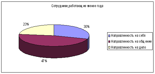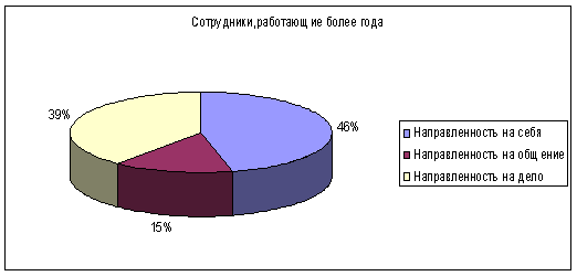 Согласно проведенным исследованиям, среди инструментальных ценностей сотрудников, работающих более года, наиболее значимыми являются: ответственность, дисциплинированность, широта взглядов, честность – ценности, более ориентированные на работу и рабочую атмосферу. Среди ценностей, имеющих значимость для сотрудников, только начавших работу в исследуемой компании, ярко выделяются следующие: жизнерадостность, образованность, смелость в отстаивании взглядов – ценности, ориентированные на карьеру, творческую деятельность, лидерство. Анализ ориентации ценностей по методике Басса приведем в аналитических диаграммах (рисунок 8 и 9).