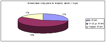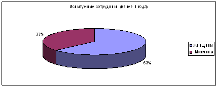 Рисунок 5. Половозрастная характеристика испытуемых, работающих менее 1 года Таким образом, среднее количество испытуемых: женщин – 58%, мужчин – 42%, среднее количество испытуемых сотрудников менее 25 лет – 30%, от 25 до 35 лет – 55%, от 35 лет и старше – 15%. ГЛАВА 3. ОЦЕНКА РЕЗУЛЬТАТОВ ИССЛЕДОВАНИЯ И ПУТИ ПОВЫШЕНИЯ ЭФФЕКТИВНОСТИ МОТИВАЦИОННОЙ ПОЛИТИКИ АКБ РОСБАНК 3.1 Анализ мотивационных потребностей сотрудников банка по результатам исследования По результатам проведенного в АКБ РосБанк опроса можно сделать следующие выводы. Согласно методике Голланда сотрудники, проработавшие более года в АКБ РосБанк имеют следующие вариации по типам (рис. 6, 7).