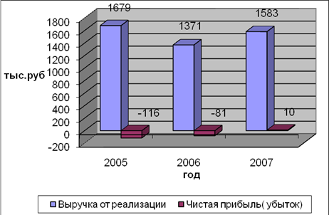 Выручка о реализации в 2005 году составила 1679 тыс. руб. В 2006 году выручка сократилась на 308 тыс. руб., или на 18,34% и составила 1371 тыс. руб. В 2007 году выручка снова немного увеличилась и составила 1583 тыс. руб., что на 15,46% выше уровня 2006 года. За период с 2005 по 2006 год организация не получала чистой прибыли, а имела лишь убытки. А в 2007 году чистая прибыль составила 10 тыс. руб. Для того, чтобы получить более наглядное представление по данным таблицы 2 построена диаграмма на рис. 1. Несмотря на то, что в 2007 году себестоимость увеличилась по сравнению с 2006 годом, организация смогла получить чистую прибыль в размере 10 тыс. руб. Это связано с одновременным увеличение выручки от реализации и превышением ее над себестоимостью.
