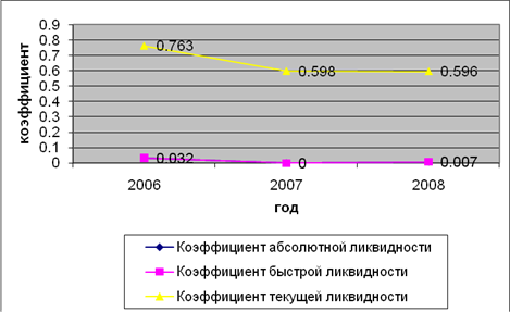 Рис.2. Динамика абсолютных показателей ликвидности на начало периода Все относительные показатели ликвидности ниже нормы, что свидетельствует о неплатежеспособности организации. На начало анализируемого периода организация могла оплатить лишь 3,2 % своих краткосрочных обязательств. А к 2008 году этот показатель снизился до 0,7%.