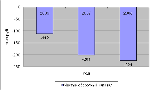 Чистый оборотный капитал анализируемой организации имеет отрицательное значение, причем наблюдается его снижение за период с 2005 по 2007 год. Это обстоятельство можно расценить как отрицательное, т.к. общество не может в любой момент расплатиться по своим краткосрочным долгам.