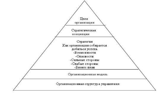 Рис. 4. Переход от целей организации к ее структуре [38] Применительно к реализации системных принципов формирования внутренней структуры аппарата управления следует учитывать, что организационная структура является сложной характеристикой системы управления. В единой системе должны рассматриваться и различные методы формирования организационных структур управления, многие из которых появились лишь в последние годы. Эти методы имеют различную природу, каждый из них в отдельности не позволяет решить все практически важные проблемы построения организационной структуры аппарата управления и должен применяться в органическом сочетании с другими. Содержание процесса формирования организационной структуры в значительной мере универсально. Оно включает в себя формулировку целей и задач, определение состава и места подразделений, их ресурсное обеспечение (включая численность работающих), разработку регламентирующих процедур, документов, закрепляющих и регулирующих формы, методы. Весь этот процесс можно организовать по трем крупным стадиям [7]: 1) формирование общей структурной схемы аппарата управления; 2) разработка состава основных подразделений и связей между ними; 3) регламентация организационной структуры. Формирование общей структурной схемы во всех случаях имеет принципиальное значение, поскольку при этом определяются главные характеристики организации, а также направления, по которым должно быть осуществлено более углубленное проектирование как организационной структуры, так и других важнейших аспектов системы (внутриорганизационного экономического механизма, способов переработки информации, кадрового обеспечения). К принципиальным характеристикам организационной структуры, которые определяются на этой стадии, можно отнести цели производственно-хозяйственной системы и проблемы, подлежащие решению; общую спецификацию функциональных и программно-целевых подсистем, обеспечивающих их достижение; число уровней в системе управления; степень централизации и децентрализации полномочий и ответственности на разных уровнях; основные формы взаимоотношений данной организации с окружающей средой; требования к экономическому механизму, формам обработки информации, кадровому обеспечению организационной системы. Основная особенность второй стадии процесса проектирования организационной структуры управления — разработка состава основных подразделений и связей между ними — заключается в том, что предусматривается реализация организационных решений не только в целом по крупным линейно-функциональным и программно-целевым блокам, но и вплоть до самостоятельных (базовых) подразделений аппарата управления, распределения конкретных задач между ними и построения внутриорганизационных связей. Под базовыми подразделениями понимаются при этом самостоятельные структурные единицы (отделы, управления, бюро, сектора, лаборатории), на которые организационно разделяются линейно-функциональные и программно-целевые подсистемы. Базовые подразделения могут иметь свою внутреннюю структуру. Третья стадия — регламентация организационной структуры — предусматривает разработку количественных характеристик аппарата управления и процедур управленческой деятельности. Она включает: определение состава внут