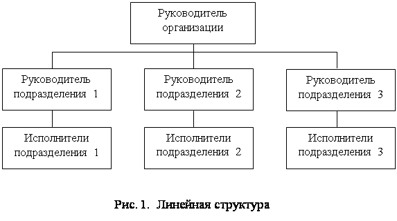 Дальнейшие разработки позволили существенно дополнить перечень свойств, характеризующих органический тип структуры управления. Речь идет о следующих чертах [32]: - решения принимаются на основе обсуждения, а не базируются на авторитете, правилах или традициях; - обстоятельствами, которые принимаются во внимание при обсуждении проблем, являются доверие, а не власть, убеждение, а не команда, работа на единую цель, а не ради исполнения должностной инструкции; - главные интегрирующие факторы - миссия и стратегия развития организации; - творческий подход к работе и кооперация базируются на связи между деятельностью каждого индивида и миссией; - правила работы формулируются в виде принципов, а не установок; - распределение работы между сотрудниками обусловливается не их должностями, а характером решаемых проблем; - имеет место постоянная готовность к проведению в организации прогрессивных изменений. Рассматриваемый тип структуры предполагает существенные изменения отношений внутри организации: отпадает необходимость в функциональном разделении труда, повышается ответственность каждого работающего за общий успех. Реальный переход к органическому типу структуры управления требует серьезной подготовительной работы. Прежде всего, компании принимают меры к расширению участия работающих в решении проблем организации (путем обучения, повышения уровня информированности, заинтересованности и т.п.), ликвидируют функциональную обособленность, развивают информационные технологии, радикально пересматривают характер взаимоотношений с другими компаниями (вступая с ними в союзы или образуя виртуальные компании, где реализуются партнерские отношения). Необходимо отметить, что органический тип структуры управления находится лишь в начальной фазе своего развития, и в "чистом" виде его используют пока немногие организации. Но элементы этого подхода к структуре управления получили довольно широкое распространение, особенно в тех компаниях, которые стремятся приспособиться к динамично меняющейся среде. 1.2.2 Классификация видов организационных структур управления- линейные (административное подчинение); - функциональные (по сфере деятельности без прямого административного подчинения); - межфункциональные, или кооперационные (между подразделениями одного и того же уровня). В зависимости от характера связей выделяются несколько основных типов организационных структур управления: - линейная; - линейно-функциональная; - дивизиональные: - продуктовая; - региональная; - ориентированная на потребителя; - матричная; - свободная. Линейные структуры. Данный вид организационной структуры относится к самым древним и самым простым структурам. Его отличают, прежде всего, естественность и прозрачность отношений между членами организации, четкость отношений власти и подчинения. Это означает, что для каждого из руководителей определены и формально зафиксированы состав его подчиненных, вышестоящие руководители, круг властных полномочий, цели. Схематично линейная организационная структура представлена на рис. 1.
