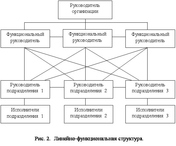 Здесь вертикальные линии обозначают организационные коммуникации, построенные по принципу руководитель — подчиненный (или наоборот — в случае обратной связи). Горизонтальные линии обозначают деловые связи между руководителями одного уровня, между коллегами (линейная структура не предусматривает горизонтальных коммуникационных связей). Этот вид структуры имеет иерархическую цепочку, расширяющуюся вниз по вертикали. Другими словами, у каждого руководителя находится в подчинении несколько (более одного) членов организации [8]. В линейной структуре не предусмотрена специализация руководителей как управленцев, а проблемы управления подразделениями организации и организацией в целом решают специалисты узкого профиля. Линейная структура в чистом виде предполагает, что на своем участке работы руководитель должен решать все проблемы производства (технологические, кадровые, проблемы снабжения, контроля, планирования и т.д.). Поведение членов организации в рамках линейной структуры полностью ориентировано на непосредственного руководителя. Любой вопрос, связанный с достижением целей подразделений организации, обязательно решается только через непосредственного руководителя. При этом без разрешения руководителей не допускаются инициативы подчиненных, новации. Конечно, это нереально без строгого, по возможности всеобъемлющего управленческого контроля. Безусловное поведение подчиненных по отношению к нормам в линейной структуре достигается благодаря отсутствию горизонтальных связей, обеспечивающих коллегиальность в решении производственных проблем и известную самостоятельность при принятии решений на низших управленческих уровнях. Успешное руководство в рамках линейной структуры возможно только при условии, что руководители всех уровней реализуют свои властные полномочия в плане учета и контроля буквально всех действий подчиненных. Вследствие этого руководители линейных структур используют в качестве мотивирующего стимула наказания и вознаграждения подчиненных. Другие способы мотивации практически не применяются. Как правило, линейные структуры целесообразны в тех случаях, когда члены коллектива обладают низкой степенью зрелости, освоили небольшое количество организационных ролей и не склонны к самостоятельным решениям и инициативе. В чистом виде линейная структура встречается преимущественно в малых организациях, которые еще не нашли свое место на рынке; в организациях, не имеющих подчиненных с высоким или средним уровнем культуры; в организациях, где процесс производства хорошо налажен и нет необходимости в частых изменениях целей и технологий. Например, такие структуры эффективны при налаженном конвейерном производстве, погрузочно-разгрузочных работах, производстве качественно неизменных продуктов питания и т.д. Линейные организационные структуры эффективны лишь в весьма ограниченном количестве случаев функционирования организации, в частности при наличии простых целей и неизменной внешней среды. В случае реального сложного рыночного окружения, творческого характера труда или целей, связанных с необходимостью адаптации к внешнему окружению, такие структуры не эффективны и следует отказываться от их реального применения. Требование видоизменения линейных структур вызвано их 