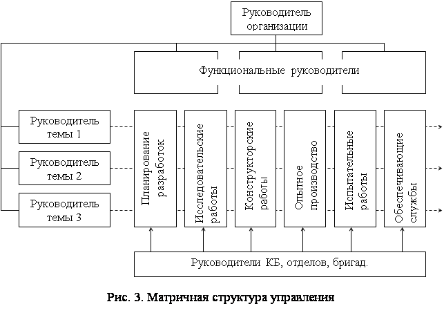 Проектные структуры различаются между собой по масштабу деятельности, широте охвата научно-технических проблем и проблем производства, характеру связей с линейными и функциональными звеньями организации, кругу полномочий для взаимодействия с внешней средой. Одной из наиболее распространенных разновидностей такой организации является матричная структура (рис. 3), при которой члены проектной команды подчиняются не только руководителю проекта, но и руководителям тех функциональных подразделений, в которых они постоянно работают. Организация развивается одновременно в двух измерениях. Таковы, например, организации, основанные на сочетании осуществляемых функций с территориальной структурой либо ориентацией на определенный тип потребителей или вид выпускаемой продукции. При такой форме организации полномочия руководителя проекта могут варьироваться от почти всеобъемлющей линейной власти до практически чисто штабных полномочий. В матричной организации руководители проектов отвечают за координацию всех видов деятельности и использование ресурсов, относящихся к данному проекту. С этой целью все материальные и финансовые ресурсы по данному проекту передаются в их распоряжение. Руководители проекта также отвечают за планирование проекта и ход его выполнения по всем количественным, качественным и временным показателям. Что касается руководителей функциональных подразделений, то они делегируют руководителю проекта некоторые из своих обязанностей, решают, где и как должна быть выполнена та или иная работа. Функциональная экспертиза продукции проводится во всех подразделениях компании. Матричная структура способствует коллективному расходованию ресурсов, что имеет существенное значение, когда выпуск продукции сопряжен с необходимостью использования редких или дорогостоящих видов ресурсов. При этом достигается определенная гибкость, которая, в сущности, говоря, отсутствует в функциональных структурах, поскольку в них все сотрудники постоянно закреплены за определенными функциональными подразделениями. Поскольку в матричной организации сотрудники набираются из различных функциональных отделов для работы по конкретному проекту, трудовые ресурсы можно гибко перераспределять в зависимости от потребностей каждого проекта. Наряду с гибкостью матричная организация открывает большие возможности для эффективной координации работ. Введение проектного управления связано с тем, что линейно-функциональная структура не может обеспечить осуществление множества проектов. При организации подразделений по специализированным функциям много усилий затрачивается на установление и выяснение взаимоотношений между дифференцированными ролями. Поскольку линейно-функциональная структура продолжает существовать наряду с проектным управлением, последнее следует скорее характеризовать как механизм преодоления недостатков и дополнения указанной структуры, а не как ее замену. Свободные структуры. Свободные (эдхократические) структуры организационного устройства в наибольшей степени приспособлены к изменениям в рыночном и институциональном внешнем окружении организации. Более того, они эффективно работают именно в условиях неопределенности основных уровней внешней среды [11]. В организации со свободной ст