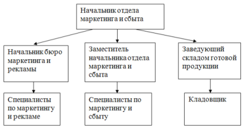 Рисунок 2.1 – Структура отдела маркетинга и сбыта ПРУП «Минскинтеркапс» Распределение обязанностей между работниками отдела осуществляется начальником отдела в соответствии с должностными инструкциями, утвержденными директором предприятия. Заместителю начальника отдела маркетинга и сбыта непосредственно подчиняется отдел маркетинга и сбыта в пределах его функциональных обязанностей. Заместитель начальника отдела маркетинга и сбыта замещает начальника отдела маркетинга и сбыта на период его отсутствия. В его подчинении находятся: один специалист по сбыту второй категории, два специалиста по маркетингу и сбыту второй категории и четыре специалиста по маркетингу и сбыту. Заместитель начальника отдела маркетинга и сбыта выполняет следующие функции: планирование и организация отгрузок готовой продукции в соответствии с заявками потребителей; определение схем и средств доставки продукции потребителям в соответствии с заключенными контрактами, надзор за условиями транспортировки; организация таможенного оформления и таможенного складирования, сертификация продукции в торгово-промышленной палате, сертификации в контрольно-аналитической лаборатории Министерства здравоохранения; правильное документальное обеспечение отгрузок, соблюдение условий упаковки и сроков отправки продукции потребителям; оптимизация транспортных потоков предприятия с учетом изменений в товаропроводящей сети и изменением рынков сбыта. Бюро маркетинга и рекламы возглавляет начальник бюро маркетинга и рекламы, в его подчинении находятся три специалиста по маркетингу и рекламе. Склад готовой продукции возглавляет заведующий складом готовой продукции, в его подчинении находится один кладовщик. Всего в отделе маркетинга и сбыта работает 15 чел. Отдел осуществляет следующие функции обеспечение успешной коммерческой деятельности предприятия по продажам продукции и оказанию услуг; проведение маркетинговых исследований, изучение платежеспособного спроса на рынке, мониторинг потенциальных рынков сбыта товаров и услуг, включая финансовое состояние и платежеспособность потенциальных покупателей, емкость, абсолютный и текущий потенциалы, соотношение спроса и предложения на конкретные виды товаров и услуг; подготовка и заключение договоров с покупателями на поставку выпускаемой продукции и оказание услуг, подготовка предложений и рекомендаций по плану производства продукции по объемам и номенклатуре; участие совместно с соответствующими службами предприятия в формировании годовых, квартальных, месячных планов производства, планов-графиков сдачи готовой продукции для соблюдения режима поставок; увязка планов запуска в производство и поставки продукции, оказания услуг с другими подразделениями предприятия; предъявление претензий другим подразделениям предприятия за невыполнение внутрифирменных обязательств по изготовлению и сдаче продукции; составление заявок на необходимые материалы и средства технического оснащения для осуществления функций продаж; подготовка оперативных заявок на ускорение изготовления отдельных видов продукции; обеспечение соблюдения нормативов остатков готовой продукции, организации правильного хранения, рассортировки, комплектации, упаковки и отправки товаров потребителям; планирован
