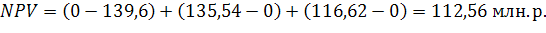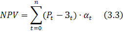 Чистая текущая стоимость (NPV) представляет собой разность дисконтированных на один момент времени (обычно на год начала реализации проекта) показателей дохода и инвестиционных расходов (капитальные вложения). Расчет производится по формуле (3.3):
