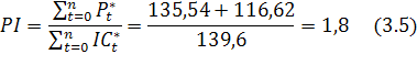 Инвестиции возвратятся в виде чистого дохода в течение 2,04 года. После возврата инвестиций предложенные мероприятия будут приносить прибыль. Рентабельность инвестиций (PI) является одним из основных показателей эффективности предприятия, с точки зрения использования привлеченных средств. Он представляет собой отношение суммы чистого приведенного дохода, полученного за весь расчетный период, к суммарным приведенным затратам за этот же период. Расчет производиться по формуле 3.5