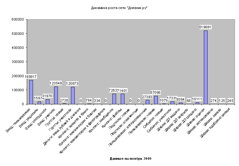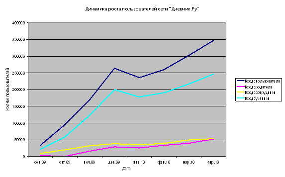 На шести следующих диаграммах представлены данные, которые позволяют анализировать динамику развития сети по ключевым составляющим, выделенным ранее. Прежде всего, нами была выстроена диаграмма (см. Рисунок 4) развития сети по параметру: вход пользователей. Можно увидеть, что за период сентября 2009 года по апрель 2010 года общая пользовательская активность клиентов сети возросла в среднем в 10 раз, однако суммарные показатели активности родителей и сотрудников в 5 раз ниже, чем активность учеников. Таким образом, основным клиентом сети, по-прежнему является ученики. Компании следует: - развивать технологии, адресованные школьникам; - с другой стороны до сих пор не найдены решения, которые бы сделали сеть актуальным ресурсом для родителей (по данным нашего опроса в Василеостровском районе – низкая активность родителей в сети обусловлена, прежде всего, низкой компьютерной квалификацией родителей, наиболее активными участниками сети оказались молодые родители - начальная школа, но именно для них – в сети меньше всего информации), одним из возможных решений может быть создание специальной обучающей программы для родителей по работе в сетях нового поколения. -