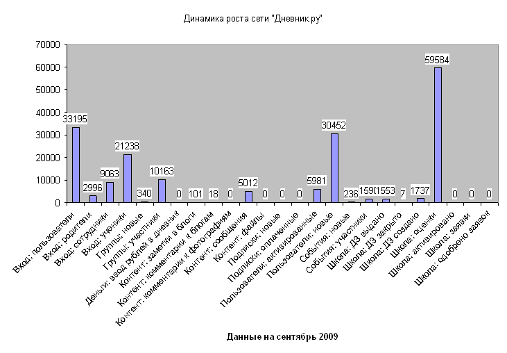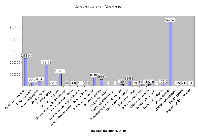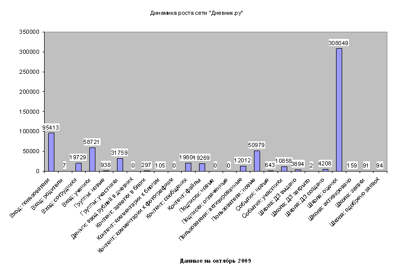 Рисунок 26 – Динамика посещаемости сети Дневник.Ру Контент сайта. Группы школ Василеостровского района: a) Школа № 700. Группы: «Педсовет: Портрет ученика инновационной школы», «Методическое объединение классных руководителей», «Европейский клуб Школы № 700» b) Школа № 31. Группы: «Клуб истории Спб», «Планета «Успешного чтения», «Клуб путешественников» c) Гимназия № 32. Группы: «Поездка по историческим местам России», «Олимпиады по информатике», «Клуб любителей математики» d) Школа № 12. Виртуальный музей «Творчество скульптора Эдуарда Агаяна» e) Школа № 15. Группа «Олимпиады и конкурсы по предметам» Работы размещенные в Медиатеке сети «Дневник.ру»: a) Школа № 15 (1) (Естественно! Науки) b) Школа № 12 (1) (Естественно! Науки) c) Гимназия № 32 (Хрщонович Виктория Анатольевна, учитель английского языка) d) Школа № 35 (Чеботарёва Евгения Александровна, учитель информатики и ИКТ) Участие администрации Василеостровского района a) Создана и ведется сеть «Система образования Василеостровского района» b) Внутри сети создана официальная страница РОНО Василеостровского района (администрирует страницу заместитель председателя РОНО Краснова Наталья Владимировна) c) Создано официальное представительство Н М Ц Василеостровского района в «Дневник.ру» |