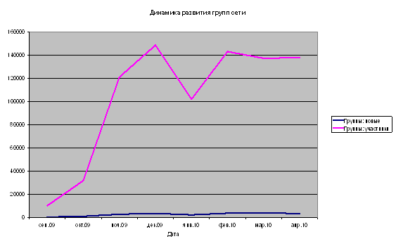 Рисунок 4 – Динамика роста пользователей сети Дневник.Ру На следующей диаграмме (см. Рисунок 5) приведены данные по динамике развития групп в сети Дневник.Ру. Мы видим, что за первые 4 месяца происходит достаточно интенсивный рост количества участников групп, которые были созданы самими пользователями. Численность групп практически достигает максимума и далее остается стабильной, если сравнивать полностью весь период исследования. Спад происходит в период декабрь-январь, когда школьники находятся на каникулах. Из чего можно сделать вывод о том, что треть школьников активно используют Дневник.Ру именно в учебное время; можно предположить, что дома они не имеют возможности выхода в Интернет.