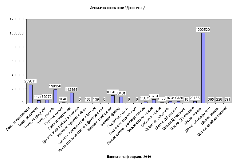 Рисунок 6 – Динамика развития контента Анализ следующей диаграммы (см. Рисунок 7) позволяет нам судить об общей динамике развития такого сервиса, как оценки. Изначально дневник делал ставку именно на этот сервис. На данный момент можно утверждать, что это растущий сервис, потребность в котором достаточно велика. Соотнося данные с диаграммой по численности сети (см. Рисунок 4) и данной диаграммой, можно утверждать, что на один вход учителя в сеть приходится проставление 26 оценок (март – период максимума), что равно объему среднестатистического класса. По анализу пользовательской практики мы знаем, что простановка оценок может происходить иным образом (то есть – когда классный руководитель проставляет сразу группу оценок по нескольким предметам), однако, и при этом условии становиться понятно, что именно сервис «оценки» является ведущей позицией с точки зрения интереса пользователей.