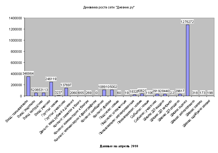 Рисунок 24 – Динамика роста сети: апрель 2010 ПРИЛОЖЕНИЕ В Реализация опытно-экспериментальной программы по развитию сети Дневник.Ру на базе Василеостровского района Санкт-Петербурга. С момента запуска (февраль 2009) эксперимента из 36 государственных образовательных учреждений Василеостровского района в образовательной сети «Дневник.ру» зарегистрировалось 31 ОУ, что составляет 86,5 % от общего числа ОУ.