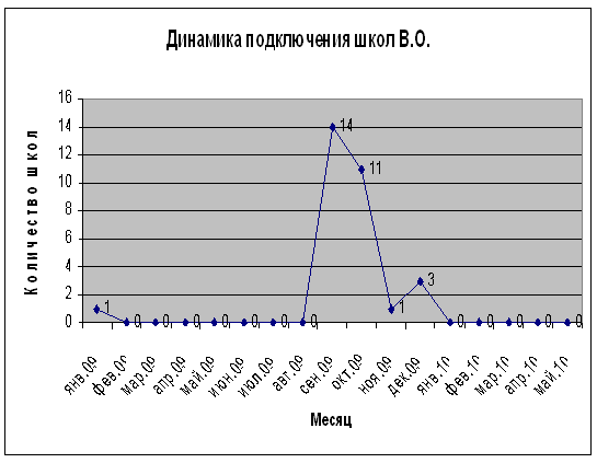 Рисунок 25 – Динамика подключения школ В.О. 21 образовательное учреждение, а это 67,7 % от числа зарегистрированных школ, ведет активную работу в сети, что подтверждается статистикой, приведенной ниже (см. рис. 26): Динамика посещаемости сети пользователями школ Василеостровского района