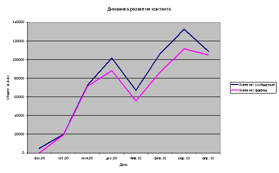 Рисунок 5 – Динамика развития групп сети Рассматривая динамику развития контента (см. Рисунок 6) можно выявить ту же тенденцию роста, что и на предыдущей диаграмме: вместе с ростом численности пользователей сети идет рост контента (файлы и сообщения), спад роста происходит в каникулярное и предэкзаменационное время. Так как два участка роста практически параллельны друг другу можно предположить, что насыщение контента еще не произошло, и мы будем видеть продолжение роста с начала следующего учебного периода. Этот факт целесообразно учесть при планировании технических возможностей сети. Сравнив данные по диаграммам рис. 4 и рис. 5 можно сделать вывод, что за каждые два входа в сеть пользователь размещает в ней одно сообщение или файл. Еще один важный вывод можно сделать, сравнивая динамику развития контента (файлы и сообщения) и динамику развития событий (см. Приложение Б): пользователи любят создавать события, рост численности событий носит тот же характер, что и развитие контента.