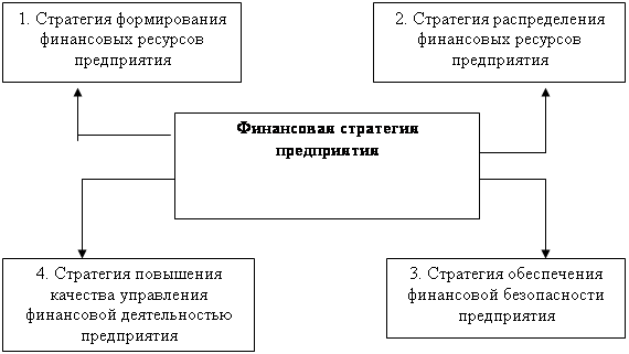 Рис. 1. Доминантные сферы общей финансовой стратегии предприятия Стратегия формирования финансовых ресурсов предприятия. Цели, задачи и основные стратегические решения этой доминанты финансовой стратегии должны быть направлены на финансовое обеспечение реализации корпоративной стратегии предприятия и соответственно подчинены ей. Стратегия распределения финансовых ресурсов предприятия. Параметры стратегического набора этой доминанты финансовой стратегии должны быть, с одной стороны направлены на финансовое обеспечение реализации отдельных функциональных стратегий и стратегий хозяйственных единиц, а с другой, составлять основу формирования направлений инвестиционной деятельности предприятия в стратегической перспективе. Стратегия обеспечения финансовой безопасности предприятия. Цели, задачи и важнейшие стратегические решения этой доминанты финансовой стратегии должны быть направлены на формирование и поддержку основных параметров финансового равновесия предприятия в процессе его стратегического развития. Стратегия повышения качества управления финансовой деятельностью предприятия. Параметры стратегического набора этой доминанты финансовой стратегии разрабатываются финансовыми службами предприятия и включаются в виде самостоятельного блока в корпоративную и отдельные функциональные стратегии предприятия. 5. Обеспечение гибкости финансовой стратегии. Будущему развитию финансовой деятельности предприятия всегда свойственна значительная неопределенность. Поэтому практически невозможно сохранить в неизменном виде разработанную финансовую стратегию предприятия на всех стадиях процесса ее реализации. Основой альтернативных стратегических действий финансовых менеджеров в таких условиях выступает высокий уровень гибкости разработанной финансовой стратегии. Стратегическая гибкость представляет собой потенциальную возможность предприятия быстро корректировать или разрабатывать новые стратегические финансовые решения при изменившихся внешних или внутренних условиях осуществления финансовой деятельности. Она достигается при такой внутриорганизационной координации финансовой деятельности, при которой финансовые ресурсы могут быть легко переведены из одних стратегических зон хозяйствования или хозяйственных единиц в другие. Возможность своевременного маневрирования финансовыми ресурсами достигается при наличии на предприятии достаточного их размера в виде страховых резервов и интегрированного управления этими резервами. Кроме того, важную роль в обеспечении гибкости финансовой стратегии играет достаточный уровень ликвидности активов и инвестиций предприятия. В этих целях предприятие может иногда сознательно поддерживать некоторые виды финансовых инвестиций с низкой доходностью, но высоким уровнем ликвидности, чтобы за счет возможности быстрого реинвестирования капитала обеспечить необходимую стратегическую гибкость. 6. Обеспечение альтернативности стратегического финансового выбора. В основе стратегических финансовых решений должен лежать активный поиск альтернативных вариантов направлений, форм и методов осуществления финансовой деятельности, выбор наилучших из них, построение на этой основе общей финансовой стратегии и формирование механизмов эффек