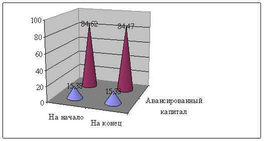 Рис. 3. Структура собственного капитала фирмы за 2008 год, %Наибольший удельный вес приходится на накопленную часть – на конец отчетного периода доля данного источника собственного капитала составила 84,47%, что на 0,15% меньше аналогичного показателя прошлого года. Следует отметить, что накопленная часть собственного капитала была преимущественно сформирована за счет добавочного капитала, удельный вес которого за 2008 год возрос на 0,72% и составил 65,31% и нераспределенной прибыли прошлых лет – 34,69%, что на 0,72 % меньше показателя 2007 года. Авансированный капитал фирмы представлен только Уставным капиталом в размере 1200 тыс. руб., причем, данный показатель в динамике за два года не изменился. Структуру собственного капитала по источникам образования имущества можно считать удовлетворительной, так как преобладающую долю в нем занимает накопленный капитал, а в его составе значительная доля приходится на нераспределенную прибыль. Та часть собственного капитала, которая направляется на финансирование оборотных активов, называется собственными оборотными средствами. Они рассчитываются по формуле: СОС=СК+ДО-ВА, (2.6) где: СОС – собственные оборотные средства; ДО – долгосрочные обязательства; ВА – внеоборотные активы. Долю собственных оборотных средств в общей величине собственных финансовых ресурсов характеризует коэффициент маневренности собственного капитала. Он рассчитывается по формуле: Км= СОС/СК (2.7) Расчет собственных оборотных средств, их доли в структуре собственного капитала на начало и конец анализируемого периода, а также изменений величины указанных показателей оформляется в таблице 9. Таблица 9 Расчет собственных оборотных средств фирмы за 2008 г.