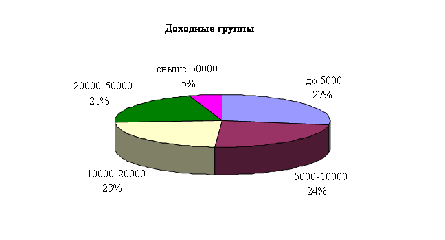 Рис. 3.2 Доходные группыРис. 4. Распределение населения по доходам Как видно из диаграммы, 4,9 % населения имеют доход на каждого члена семьи более 50000 рублей. Интерес представляет именно этот сегмент рынка. На основании исследований основными покупателями потребительских товаров являются женщины в возрасте 25-54 лет с уровнем дохода выше среднего. На втором месте – мужчины в возрасте 25-54 года. Если говорить о семейных покупателях, то наибольший интерес принадлежит покупателям с маленькими детьми и школьниками. Посмотрим, как распределяются эти слои населения в общей массе населения. По данным статистического управления в г. Казани численность населения на 01.01.08 года составила 873,9 тысяч человек. Рассмотрим состав домохозяйств. По данным составляем таблицу 22. Таблица 22 Состав домохозяйств