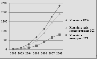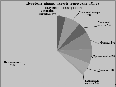 Рис. 3.1. Динаміка зростання кількості компаній з управління активами та інститутів спільного інвестування у 2002-2008 роках [49, с.22-27] Аналітики відзначають, що у відносному виразі найбільше продовжує зростати кількість відкритих ІСІ, що свідчить про зростання попиту на такі ІСІ з боку інвесторів-новачків, бо вони обирають найбільш ліквідні та найменш ризиковані інструменти для інвестування. Венчурні проекти демонструють не такі темпи зростання, натомість з самого початку венчурні компанії у більшості як корпоративних інвестиційних фондах – КІФ (відкритих, закритих, інтервальних, венчурних), так і пайових – ПІФ (закритих і венчурних). Аналогічно високі темпи характерні для емісії цінних паперів та реальної вартості активів. Зростання на 137-256% та 131-250%, тобто в рази, вражає. Деякі аналітики пов’язують це з припливом українського ж капіталу, раніше виведеного за кордон, інші вважають це природним явищем для привабливого нового фондового ринку. Характерно, що ситуація 2005 року мало вплинула на темпи надходжень прямих іноземних інвестицій в Україну: рівномірно 20-30% на рік (виняток становить тільки 2005 рік – 87%). Із 2005 року зберігається тенденція, коли майже 80% усіх фондів, у яких сконцентровано більше ніж 90% зареєстрованої емісії цінних паперів, належать до венчурних. На них в Україні не діють жорсткі умови диверсифікації. За своїм призначенням венчурні фонди відповідають європейській моделі, а не американській [54, с.83-90]. На рис.3.2 наведено галузі інвестування венчурних фондів. Як видно, 63% венчурних інвестицій не визначено, тобто щодо цього напрямку відсутня звітність венчурних ІСІ. Вважається, що для українських венчурних фондів цікавими є, перш за все, сфери будівництва та нерухомості.