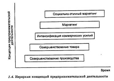 Анализ их практической реализации является исходной информацией для корректировки осуществляемых стратегий маркетинга. Каждая из перечисленных выше областей деятельности, безусловно, важна сама по себе. Зачастую только она и реализуется фирмой на должном уровне. Однако, несомненно, то, что ценность и значимость каждого из этих видов деятельности имеет свое наибольшее значение тогда, когда они рассматриваются и осуществляются в единстве и целостности. В таком случае говорят о реализации концепции маркетинга. Предприниматель, использующий концепцию маркетинга, считает, что он знает нужды и потребности потребителей его продукции и обеспечивает их удовлетворение более эффективно, чем это делают его конкуренты. Используя концепцию маркетинга, предприниматель производит и продает то, что нужно людям, а не навязывает им то, что уже произведено. Свои интересы в получении определенной прибыли предприниматель удовлетворяет за счет обеспечения потребностей покупателей. Таким образом, достигается сбалансированность двух факторов: прибыли фирмы и потребности покупателей. Концепции предпринимательской деятельности Наряду с концепцией маркетинга существуют и другие концепции осуществления предпринимательской деятельности. Основными из них являются концепции: • совершенствования производства; • совершенствования товара; • интенсификации коммерческих усилий; • социально-этичного маркетинга. Среди этих концепций более привлекательной является концепция социально-этичного маркетинга (рис. 1.4).
