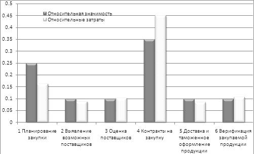 Исходя из данных таблицы 3.4 итоговая стоимость процесса составляет 17,01 млн. руб. / год, а входящих в него основных функций: - планирование закупки – 2,79; - выявление возможных поставщиков – 1,52; - оценка поставщиков – 1,75; - контракты на закупку – 7,68; - доставка и таможенное оформление продукции – 1,45; - верификация закупленной продукции – 1,82. Значимость функций оценивается исходя из экспертных оценок. Она производилась методом попарных сравнений. Экспертам предлагалось сравнить по степени важности друг с другом попарно все функции одного класса. После того, как были получены опросные листы от всех экспертов, было проведено исследование с целью определения уровня достоверности полученных оценок. Согласованность оценок определялась по критерию с2. Оценки оказались согласованными с надежностью 0,95. Функции были ранжированы по количеству набранных по строкам баллов. Затем путем деления количества баллов по каждой функции на сумму баллов по всем функциям была определена их относительная значимость. Результаты экспертной оценки представлены в таблице 3.5. Таблица 3.5 – Результаты экспертной оценки значимости функций