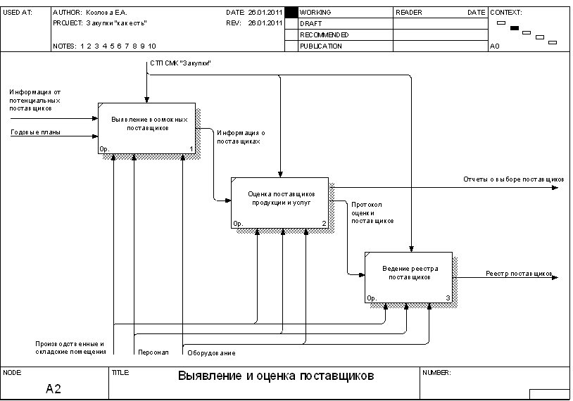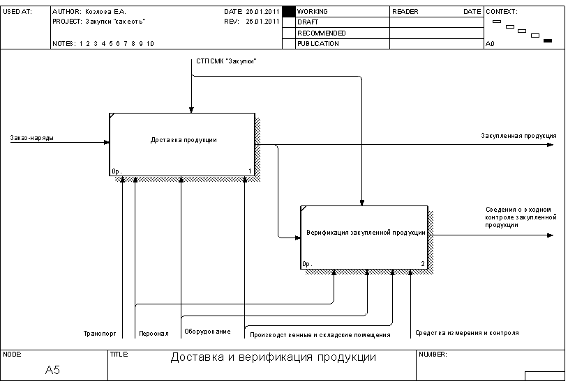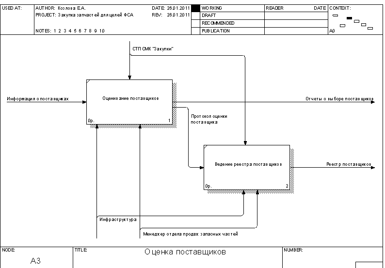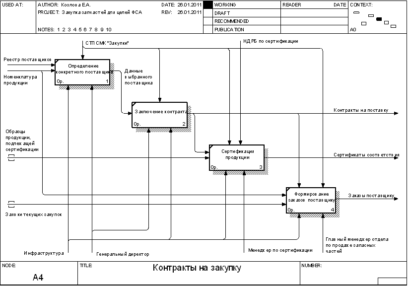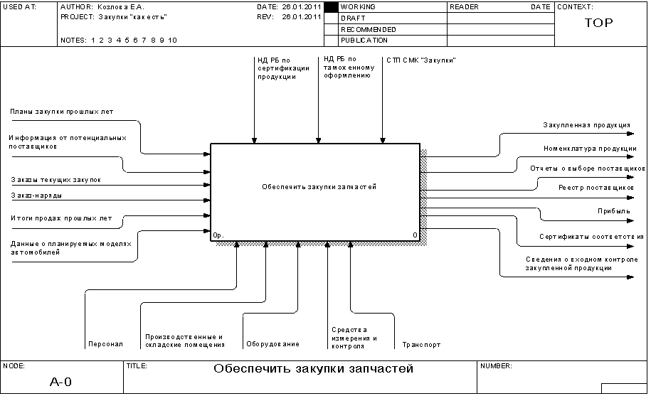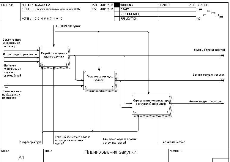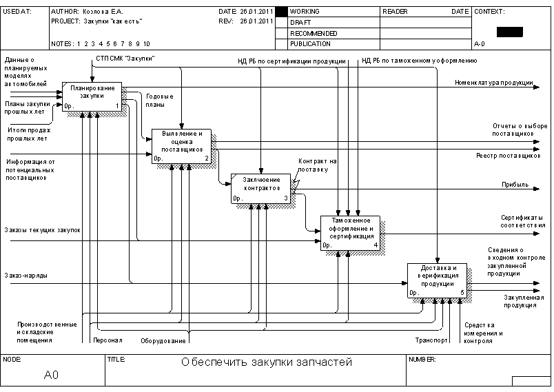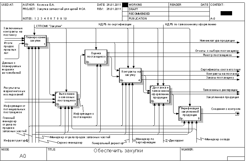 Рисунок 1.5 – Диаграмма декомпозиции процесса доставки и верификации продукции 2. Функциональная модель процесса закупки запчастей для целей ФСА Целью проводимого функционально-стоимостного анализа является определение возможностей снижения издержек в организации управления процессом закупки запчастей. При этом ФСА будет являться корректирующим. Построим функциональную модель процесса в соответствии с целями функционально-стоимостного анализа. Контекстная диаграмма процесса приведена на рисунке 2.1. Входными данными процесса являются: - итоги продаж прошлых лет; - заключенные контракты на поставку; - результаты маркетинговых исследований; - информация от потенциальных поставщиков; - данные о планируемых моделях автомобилей. Выходными данными процесса являются: - номенклатура продукции; - реестр поставщиков; - отчеты о выборе поставщиков; - таможенные декларации; - заказы поставщику; - контракты на поставку; - сертификаты соответствия; - закупленная продукция. Контроль осуществляется на основании СТП СМК "Закупки", НД РБ по сертификации, НД РБ по таможенному оформлению. Механизмами обеспечения процесса являются: - сотрудники предприятия: генеральный директор, главный менеджер отдела продаж запасных частей, менеджер отдела продаж запасных частей, менеджер по сертификации, сервис-менеджер, декларант, менеджер склада; - инфраструктура, включая комплекс помещений с необходимым оборудованием, а также обеспечение ИТ, связью и прочее. В ходе декомпозиции выделим шесть подпроцессов: - планирование закупки; - выявление возможных поставщиков; - оценка поставщиков; - контракты на закупку; - доставка и таможенное оформление продукции; - верификация закупленной продукции. Диаграмма декомпозиции приведена на рисунке 2.2. В ходе дальнейшей декомпозиции построим три диаграммы, уточняющие некоторые из выделенных процессов: - планирование закупок (рисунок 2.3); - оценка поставщиков (рисунок 2.4); - контракты на закупку (рисунок 2.5).