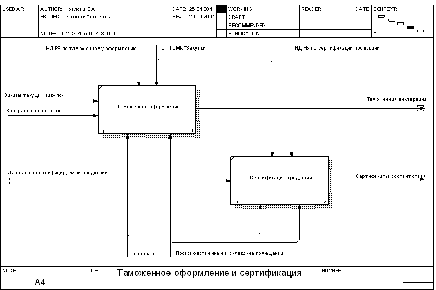 Рисунок 1.1 – Контекстная диаграмма процесса закупки В ходе декомпозиции процесса таможенного оформления и сертификации получим две функции второго уровня: - таможенное оформление; - сертификация продукции. Диаграмма декомпозиции процесса таможенного оформления и сертификации приведена на рисунке 1.4. В ходе декомпозиции процесса доставки и верификации продукции получим две функции второго уровня: - доставка продукции; - верификация закупленной продукции. Диаграмма декомпозиции процесса доставки и верификации продукции приведена на рисунке 1.5.