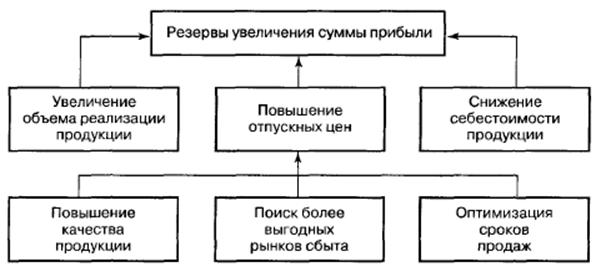 среднереализационных цен и себестоимости единицы продукции: Аналогично осуществляется факторный анализ рентабельности операционного капитала (отношение прибыли от основной деятельности к средней сумме операционного капитала). 2.1.4.Методика определения резервов роста прибыли и рентабельности Основные источники резервов увеличения суммы прибыли (которые определяются по каждому виду продукции): увеличение объема реализации продукции, снижение её себестоимости, повышение качества продукции, реализация её на более выгодных рынках сбыта и т.д. (рис. 2) Рис. 2. Основные направления поиска резервов увеличения прибыли от реализации продукции