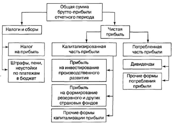 Основные источники резервов повышения уровня рентабельности продукции – увеличение суммы прибыли от реализации продукции (Р П) и снижение её себестоимости (Р С). 2.1.5 Анализ использования прибыли Для анализа используются закон о налогах и сборах, взимаемых в бюджет, инструктивные и методические указания Министерства финансов, устав предприятия, а также данные отчета о прибылях и убытках, приложения к балансу, отчета о движении капитала, расчетов налога на имущество, на прибыль, на доходы и др. Распределение прибыли показано на рис. 3, из которого видно, что одна её часть в виде налогов и сборов поступает в бюджет государства и используется на нужды общества. Оставшаяся сумма – чистая прибыль – используется на выплату дивидендов акционерам предприятия, на расширение производства, создание резервного капитала и др. Рис.3. Общая схема распределения прибыли.