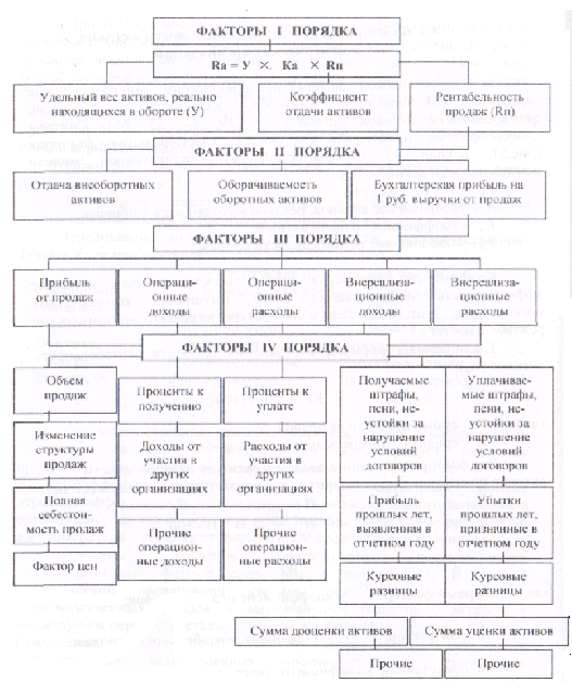 Рентабельность продукции, исчисленная по разным показателям, меняется неодинаково, однако в сторону увеличения. Так, например, рентабельность продаж по прибыли от продаж увеличилась на 7,45%. Аналогичный показатель по чистой прибыли увеличился на 4,23%. Рентабельность затрат увеличилась на 9,2%. Это связано с тем, что полная себестоимость снижалась быстрее выручки от продаж. В целом доходы увеличивались быстрее расходов. 3.5 Анализ влияния факторов на рентабельность активов коммерческой организации Рентабельность активов (имущества, капитала, общая рентабельность) характеризует эффективность использования всех авансированных (вложенных) средств, как собственных, так и заемных. Показывает степень использования всего имущества, которое находится на балансе, а не только использованные его части (как, например, рентабельность продукции). Отрицательная динамика показателя свидетельствует либо о перенакоплении актива, либо о трудностях в сбыте продукции.[8] Определим влияние факторов на изменение показателя рентабельности активов.