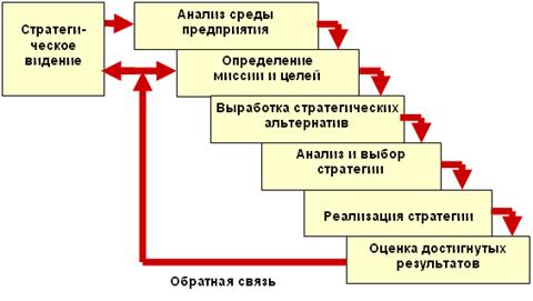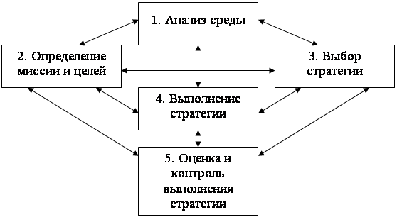 оценка и контроль выполнения стратегии. Рисунок 3 – Этапы процесса стратегического управления Рассмотрим предложенные этапы более подробно. Анализ среды является исходным процессом в стратегическом управлении, так как он создает базу для определения миссии и целей организации, выработки стратегии ее развития. Внутренняя среда организации анализируется по следующим направлениям: маркетинг, финансы и учет, производство, персонал, организация управления. При анализе внешнего окружения исследуются экономические, политические, социальные, международные факторы, а также факторы конкуренции. При этом внешнее окружение делят на два компонента: непосредственное окружение (среда прямого воздействия) и макроокружение (среда косвенного воздействия). Целью стратегического анализа служит выявление угроз и возможностей внешней среды, а также сильных и слабых сторон организации (это так называемый SWOT-анализ). Процесс определения миссии и целей состоит из трех подпроцессов: • формулирование миссии организации, которая в конкретной форме выражает смысл ее существования; • определение долгосрочных целей; • определение среднесрочных целей. Формулирование и выбор стратегии предполагают формирование альтернативных направлений развития организации, их оценку и выбор лучшей стратегической альтернативы для реализации. При этом используется специальный инструментарий, включающий количественные методы прогнозирования, разработку сценариев будущего развития, портфельный анализ. Реализация стратегии является критическим процессом, так как именно он в случае успешного осуществления приводит предприятие к достижению поставленных целей. Реализация стратегии осуществляется через разработку программ, бюджетов и процедур, которые можно рассматривать как среднесрочные и краткосрочные планы реализации стратегии. Основные составляющие успешного выполнения стратегии: • цели стратегии и планы доводятся до работников с тем, чтобы достичь с их стороны понимания того, к чему стремится организация, и вовлечь в процесс реализации стратегии; • руководство своевременно обеспечивает поступление всех необходимых для реализации стратегии ресурсов, формирует план осуществления стратегии в виде целевых установок; • в процессе реализации стратегии каждый уровень руководства решает свои задачи и осуществляет закрепленные за ним функции. Результаты реализации стратегии оцениваются, и с помощью системы обратной связи осуществляется контроль деятельности организации, в ходе которого может происходить корректировка предыдущих этапов. В настоящее время существуют различные взгляды (подходы) к последовательности этапов процесса стратегического управления. Первый подход основывается на том, что сначала необходимо проводить анализ среды, а потом устанавливать миссию и цели организации, обосновывая это тем, что, не имея представления о среде функционирования предприятия, трудно и невозможно установить миссию и реальные цели. Другой подход, напротив, заключается в том, что сначала следует определить миссию и цели фирмы и только потом переходить к анализу среды, т.к. зная миссию и цели можно определить требуемую информацию для анализа, т.е. сузить круг анализа и сократить время и средства, затраченное на его проведение. Способом разрешен