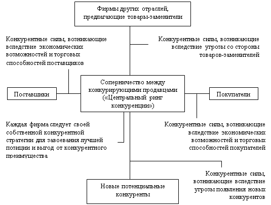 Таким образом, к возможностям, которые необходимо использовать обязательно, можно отнести следующие: получение государственной поддержки через участие в Федеральной целевой программе; рост спроса из-за высокой потребности в подвижном составе нового поколения из-за высокой степени износа подвижного состава РЖД и др. потребителей, средний уровень насыщенности ранка сбыта; ожидаемое повышение спроса на продукцию завода в связи с ростом уровня развития промышленности и других отраслей и др. К угрозам, которые необходимо устранить или выбрать меры по их устранению относятся в первоочередном порядке: увеличение уровня конкуренции; снижение численности квалифицированных кадров в регионе в результате оттока населения и спад уровня образования и подготовки специалистов; внедрение новых технологий и стандартов качества; рост цен на сырье и тарифов на энергию и, как следствие, рост себестоимости продукции и др. Анализ среды прямого воздействия. Одной из основных характеристик отрасли и конкурентной ситуации, без анализа которой нельзя разработать полноценную конкурентную стратегию, является интенсивность конкуренции. Оценить ее можно с помощью модели Портера пяти видов (факторов) конкуренции, включающая в себя: угроза вытеснения; власть покупателей; власть поставщиков; угроза заменителей; уровень конкурентной борьбы. Анализ этих ключевых сил помогает предприятию разрабатывать эффективную стратегию, которая позволит ему занять прочную позицию в борьбе с конкурентами. Взаимодействие этих сил можно представить в виде рис. 2.1. Рассмотрим суть каждой из пяти ключевых сил конкуренции. Угроза вытеснения. Угроза вытеснения зависит от количества барьеров. Наиболее серьезными барьерами, препятствующими вытеснению предприятия более сильными конкурентами, являются эффект масштаба, потребность в капитале, эффект роста производительности труда, дифференциация продукта [50, 39].