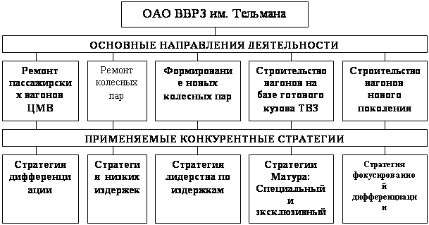 2.3 Рекомендации по выбору бизнес-стратегий дл ОАО ВВРЗ им. Тельмана.Далее рассмотрим основные конкурентные стратегии, которые необходимо применять на исследуемом предприятии. ОАО ВВРЗ им. Тельмана является предприятием с диверсифицированным производством (рис. 2.3). Поэтому определение конкурентных стратегий осуществляется для каждого из его видов. Если использовать для этого основополагающую модель М. Портера, можно выделить следующие виды используемых на заводе стратегий.