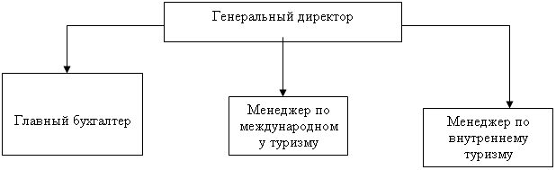 В таблице 3 представлена калькуляция затрат по одной путевке туроператора CORAL TRAVEL. 4.4 Расчет потребности в производственном персоналеИзвестно, что наиболее точный метод расчета численности производственных рабочих исходит из нормативной трудоемкости выполнения работ (операций). Однако, во-первых, этот метод применим только к сдельным, нормируемым работам, во-вторых, когда накоплена информация о трудовых нормах и нормативах применительно к освоенной аналогичной продукции. При разработке бизнес-плана разработчикам приходится пользоваться приближенными методами, используя скудную информацию о проектируемом производственном процессе. Наиболее простым и логичным, хотя и не слишком точным методом определения численности рабочих для организуемого производства (бизнеса) является метод расстановки по рабочим местам. Суть метода заключается в том, что каждая операция имеет то или иное количество рабочих мест, а рабочие места должны быть заняты рабочими. Обычно, количество рабочих не равно строго количеству рабочих мест. Предполагаемый штат сотрудников фирмы - 4 человека, среди них: - генеральный директор (учредитель фирмы); - главный бухгалтер; - менеджер по международному туризму; - менеджер по внутреннему туризму (по России). Как мы видим фирма «КоралОтдых» представляет собой малое предприятие в форме ООО. В составе персонала не более 10 человек. Предполагается также использовать вспомогательных рабочих вне штата, а именно: для распространения рекламных буклетов и брошюр. В перспективе фирмой планируется создать собственный отдел рекламы, что приведет к расширению структуры фирмы и привлечению нового персонала. Планируется расширить фирму до 10 человек. 5 Организационный план5.1 Разработка организационной структурыОрганизационная структура - это внутреннее устройство системы управления предприятием, включающее совокупность структурных единиц и должностных лиц, взаимную соподчиненность этих структурных единиц, взаимосвязи структурных единиц как между собой, так и с производственными единицами. Основные принципы, которыми следует руководствоваться при разработке организационной структуры, заключаются в следующем: 1) соблюдение принципа единоначалия, т.е. каждая структурная единица должна быть административно подчинена только одному вышестоящему руководителю; 2) соблюдение принципа многоуровневого иерархического построения, согласно которому каждый руководитель и подразделение относятся к тому или иному уровню управления: верхнему, среднему или нижнему; 3) соблюдение принципа линейно-функционального управления; 4)