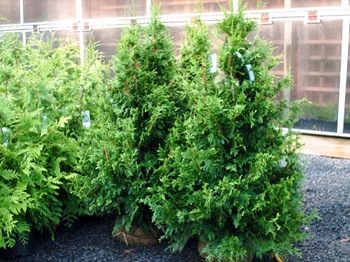 Также на участке в красоте елочкам едва уступают более неприхотливые туи западные. Например, туя западная Брабант с конической формой кроны и ярко-зеленой хвоей — быстрорастущий сорт, во взрослом состоянии достигающий 4м.