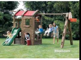 Дорога от гаража, ведёт прямо к дому. Слева от дома, находится детская площадка, с качелями, горкой, песочницей и лесенками.