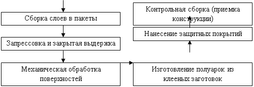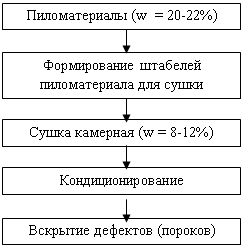 3.7 Технологический процесс производства Пиломатериал поступает на предприятие в виде обрезных досок с размерами 5000х130х40, 5000х160х32, 1750х130х50 мм. Пиломатериал с влажностью 20-22% после атмосферной сушки подают в цех на площадку формирования штабелей для дальнейшей камерной сушки. Формирование штабелей происходит ручным способом. Для облегчения укладки пиломатериала на тележки площадка оборудована вертикальным подъемником (Л6,5-15). Готовые штабеля на тележках по рельсовым путям подаются в сушильную камеру СПМ-2К. Перемещение тележек с пиломатериалом производится специальной траверсной тележкой (ЭТ-2-6,5). Производится сушка пиломатериала до влажности 8-12%. Камерная сушка ведется по легкому режиму, при температуре не выше 60°С. После окончания сушки материал транспортируется в зону кондиционирования для выдержки не менее 3-х суток в помещении с относительной влажностью воздуха 65-75% при температуре 16-22°С. После кондиционирования материал сортируется. Дефектные покоробленные доски отбраковываются. Пригодный для дальнейшей работы пиломатериал транспортируется на склад. Со склада пиломатериал поступает в специально оборудованный цех, состоящий из нескольких участков. Сначала пиломатериал отправляется на вскрытие дефектов на рейсмусовый станок «СР6-1 Днепр». Здесь поперечное сечение деталей доводится до заданных размеров, и создаются базовые поверхности. После обработки поверхностей и вскрытия дефектов пиломатериал поступает на участок торцовки, где из досок вырезаются дефектные места и недопустимые пороки древесины. Торцовка выполняется на станке ЦПА-40. Сращивание заготовок по длине производится с помощью шипового соединения. Операция фрезерования зубчатых шипов, выполняется на шипорезном станке ШО16-4М, рабочим органом, которого являются специально изготовленные фрезы. Для склеивания заготовок используется клей КБ-3. На зубчатые шипы клей наносится с помощью клеенаносителя. Стыковка заготовок производится с помощью линии сращивания КДК. На период отверждения клея ленты должны находится в неподвижном состоянии в течении несколько часов. После необходимой для отверждения клея выдержки готовые ленты подаются к рейсмусовому станку на очередную механическую обработку с целью удаления остатков клея и получения точной геометрической формы. Фрезерование производят с двух сторон, причем точность обработки должна обеспечивать требуемое качество склеивания. Максимальная высота неровностей на поверхности, определяемая по ГОСТ 7016-82, не должна превышать 200 мкм. В процессе механической обработки склеенных по длине заготовок для многослойных конструкций (слоев) их кромки не обрабатываются. Последние подлежат обработке одновременно с фрезерованием боковых поверхностей элементов конструкции. Ленты обрабатываются в порядке, обратном укладке слоев в пакет, чтобы ленты было удобнее подавать на клейку и быстрее загружать в пресс. Клей на поверхность досок наносится механизированными клеевыми вальцами КВ-9 с одной или двух сторон ровным слоем с расходом 0,2-0,6 кг/м2. Толщина клеевого шва колеблется от 0,1 до 0,8 мм. Максимальная прочность обеспечивается при толщине клеевой прослойки 0,1-0,2 мм. Ленты, промазанные клеем, укладываются в пакет. Запрессовка пакета осуществляется в горизонтальных прессах под давлением 0,5-1 МПа. В пресс загружа