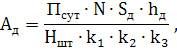 где Псут – суточная производительность по данной детали, шт/сут; N – время хранения, сут; Sд – площадь, занимаемая одной деталью, м2; hд – высота детали, м; Hшт – высота штабеля, м; k1 – коэффициент объемного заполнения штабеля; k2 – коэффициент неполноты укладки штабеля; k3 – коэффициент использования площадей склада;