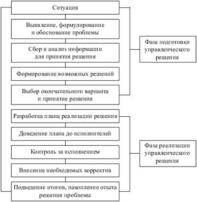 4. РОЗРОБКА МЕХАНІЗМІВ ПРИЙНЯТТЯ УПРАВЛІНСЬКИХ РІШЕНЬ В ОРГАНІЗАЦІЇУправлінське рішення - це результат конкретної управлінської діяльності менеджменту. Ухвалення рішень є основою управління. Вироблення і ухвалення рішень - це творчий процес в діяльності керівників будь-якого рівня, що включає: вироблення і постановку мети; вивчення проблеми на основі отримуваної інформації; вибір і обґрунтування критеріїв ефективності (результативності) і можливих наслідків схвалюваного рішення; обговорення з фахівцями різних варіантів вирішення проблеми (завдання); вибір і формулювання оптимального рішення; ухвалення рішення; конкретизацію рішення для його виконавців. Технологія менеджменту розглядає управлінське рішення як процес, що складається з трьох стадій: підготовка рішення: ухвалення рішення; реалізація рішення. Управлінські рішення можуть бути обґрунтованими, такими, що приймаються на основі економічного аналізу і багатоваріантного розрахунку, і інтуїтивними, які, хоча і економлять час, але містить в собі вірогідність помилок і невизначеність. Схвалювані рішення повинні ґрунтуватися на достовірній, поточній і прогнозованій інформації, аналізі всіх чинників, що роблять вплив на рішення, з урахуванням передбачення його можливих наслідків. Керівники зобов'язані постійно і всесторонньо вивчати інформацію, що поступає, для підготовки і ухвалення на її основі управлінських рішень, які необхідно погоджувати на всіх рівнях внутрішньо фірмової ієрархічної піраміди управління. Кількість інформації, яку необхідно переробити для вироблення ефективних управлінських рішень, настільки велика, що воно давно перевищило людські можливості. Саме труднощі управління сучасним великомасштабним виробництвом зумовили широке використання електронно-обчислювальної техніки, розробку автоматизованих систем управління, що зажадало створення нового математичного апарату і економіко-математичних методів. Урівноважені рішення ухвалює менеджер, уважно і що критично відноситься до своїх дій, гіпотез, що висуваються, і їх перевірки. Імпульсні рішення характерні для менеджера, який легко генерує найрізноманітніші ідеї в необмеженій кількості, але не в змозі їх як слід перевірити, уточнити, оцінити. Схвалюване управлінське рішення повинне відповідати наступним вимогам: бути науково обґрунтованим, компетентним; прийматися на основі достовірної, повної і своєчасної інформації з аналізом і оцінкою можливих альтернатив; бути несуперечливим; мати ясну спрямованість і адресність; відрізнятися своєчасністю і швидкодією; володіти точністю і ясністю; бути контрольованим; мати комплексний характер; володіти повноважністю; бути економічним і ефективним. Процес підготовки і реалізації управлінського рішення в ТОВ «ЛАРОС» передбачає виконання в певній послідовності цілого ряду робіт, що включають фазу ухвалення і фазу реалізації управлінського рішення (мал. 4).