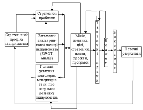 2. ФОРМУВАННЯ ФУНКЦІЙ МЕНЕДЖМЕНТУ НА ПІДПРИЄМСТВІ 2.1 ПЛАНУВАННЯ Планування як основна функція менеджменту є видами діяльності по формуванню засобів дії, що забезпечують єдиний напрям зусиль всіх членів фірми на досягнення загальних цілей. Планування як процес управління включає розробку і реалізацію засобів дії: концепцію, прогноз, програму, план. Кожен із засобів дії має свою специфіку і умови використання. Функція планування припускає рішення про те, якими повинні бути цілі організації і що повинні робити члени організації, щоб досягти цих цілей. Стратегічним плануванням є набір дій і рішень, зроблених керівництвом, які ведуть до розробки специфічних стратегій, призначених для того, щоб допомогти організації досягти своїх цілей. Модель стратегічного планування, яка використовується на ТОВ «ЛАРОС» базується на врахування ринкових переваг (мал.1)